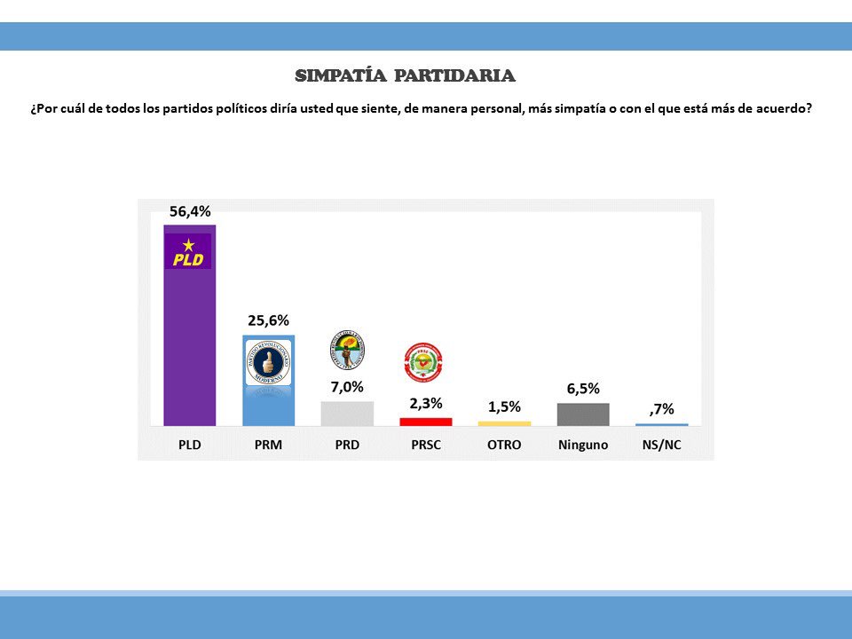 Por partidos: PLD 56.4%, PRM 25.6%, PRD 7%, PRSC 2.3%, Otros/Ns/Nr 7.2%.